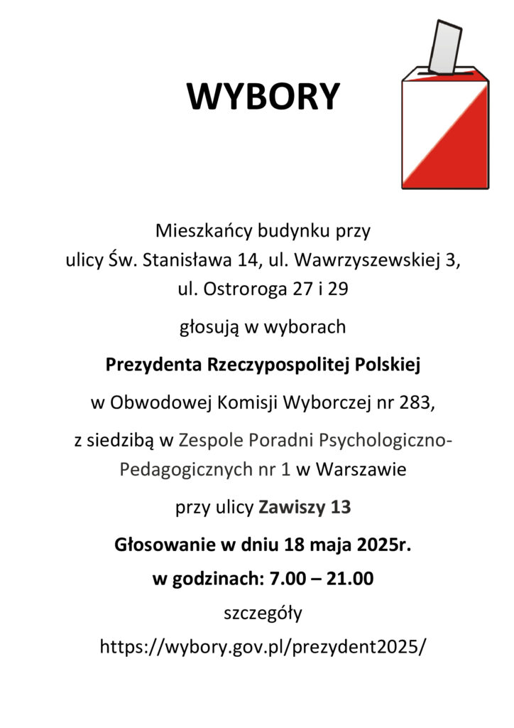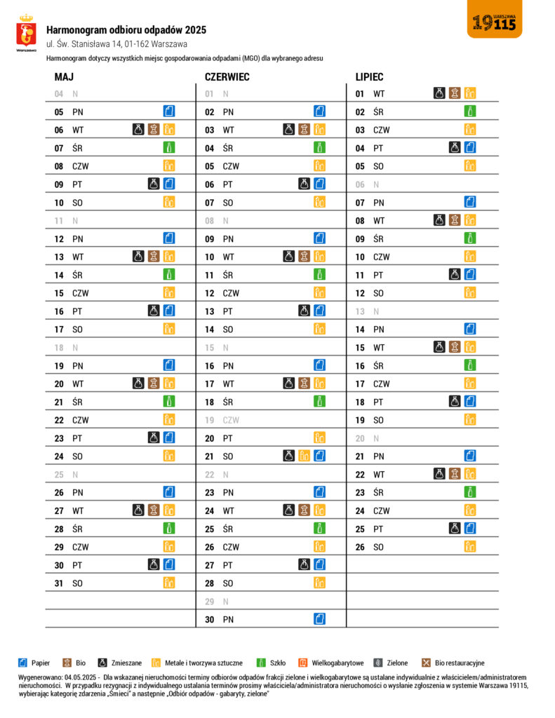 Harmonogram wywozu odpadów ul. św. Stanisława 14, ul. Wawrzyszewska 3 oraz ul. Ostroroga 27