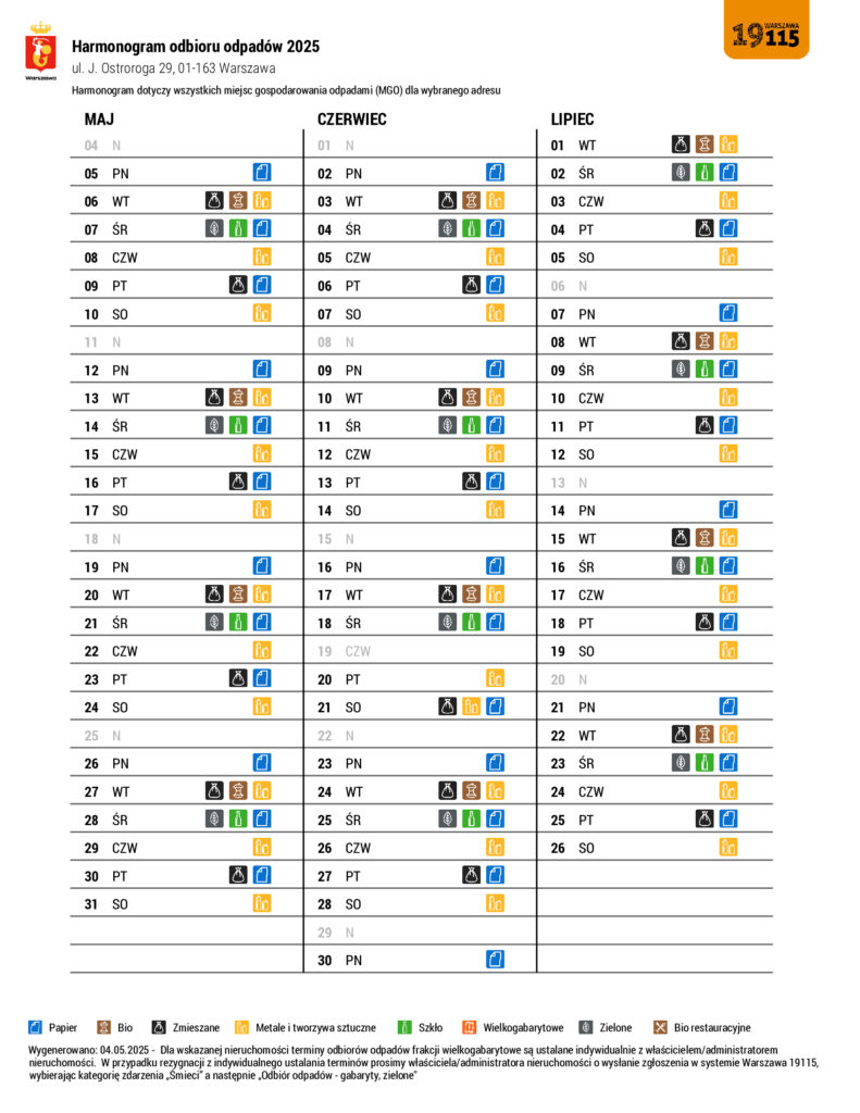 Harmonogram wywozu odpadów ul. Ostroroga 29