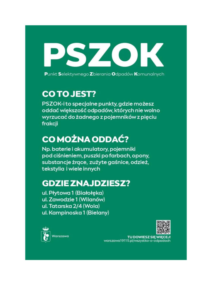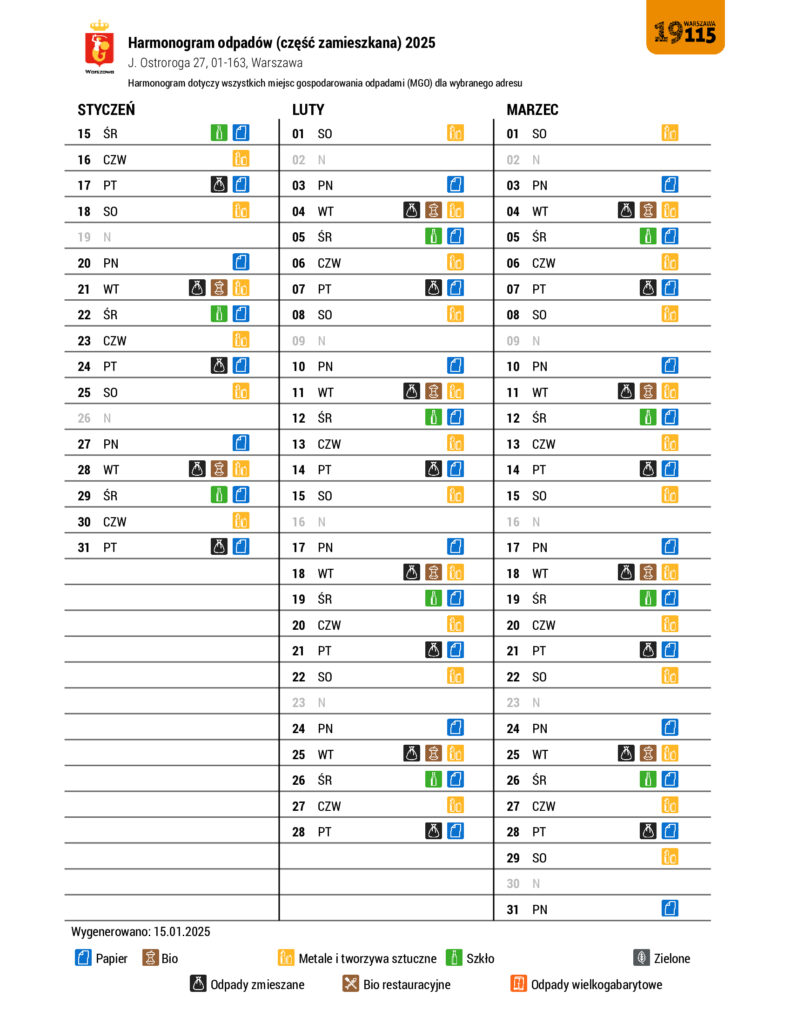 Harmonogram odbioru odpadów ul. Ostroroga 27 i 29, ul. Wawrzyszewska 3, ul. św. Stanisława 14