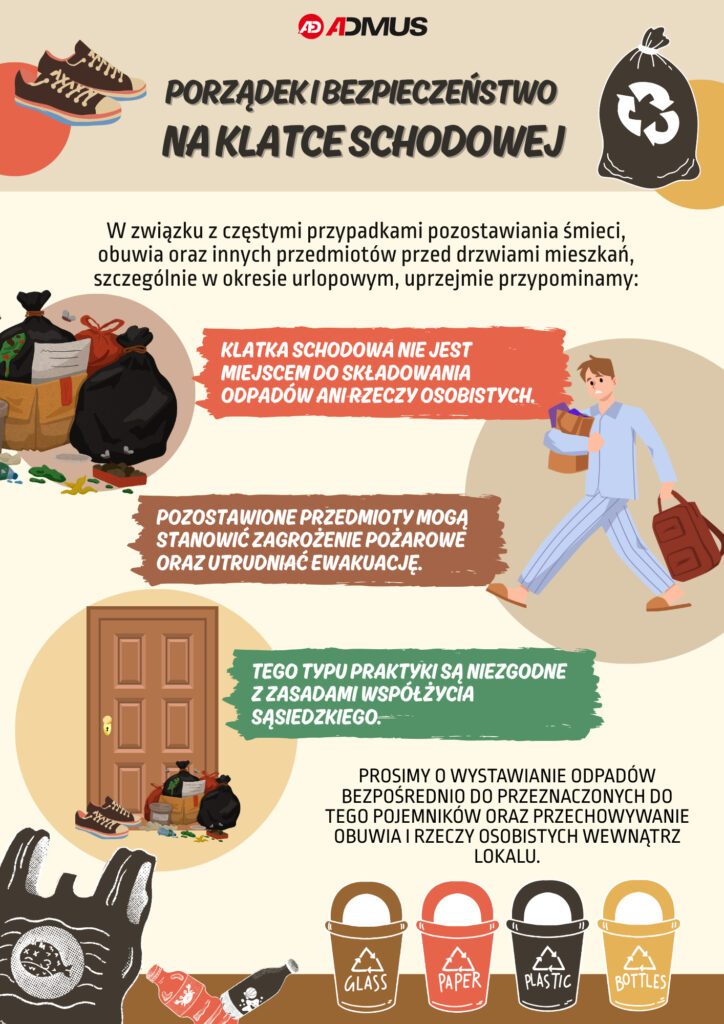 Prosimy o dostosowanie się do zaleceń i uprzątnięcie przedmiotów przechowywanych w przestrzeniach wspólnych, które mogą naruszać powyższe przepisy.